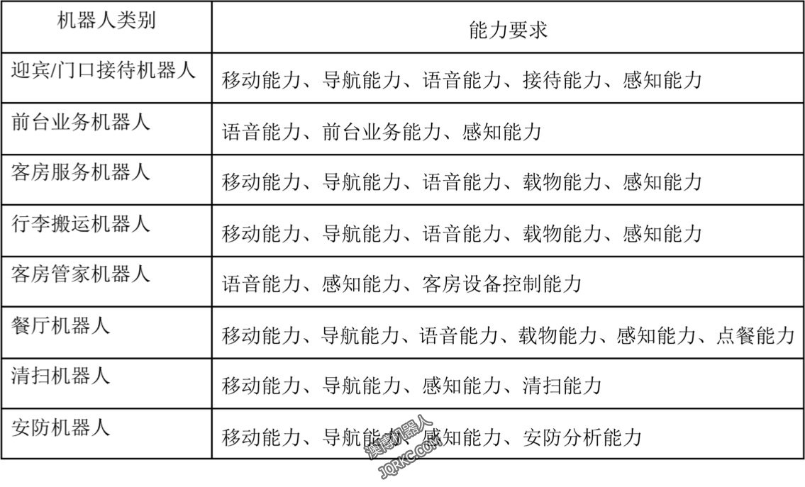 具體來說,一個(gè)酒店內(nèi)交由效力機(jī)器人結(jié)束的工作包含了八項(xiàng),對(duì)應(yīng)八類不一樣的效力機(jī)器人,而這八類效力機(jī)器人的才干懇求也不一樣。